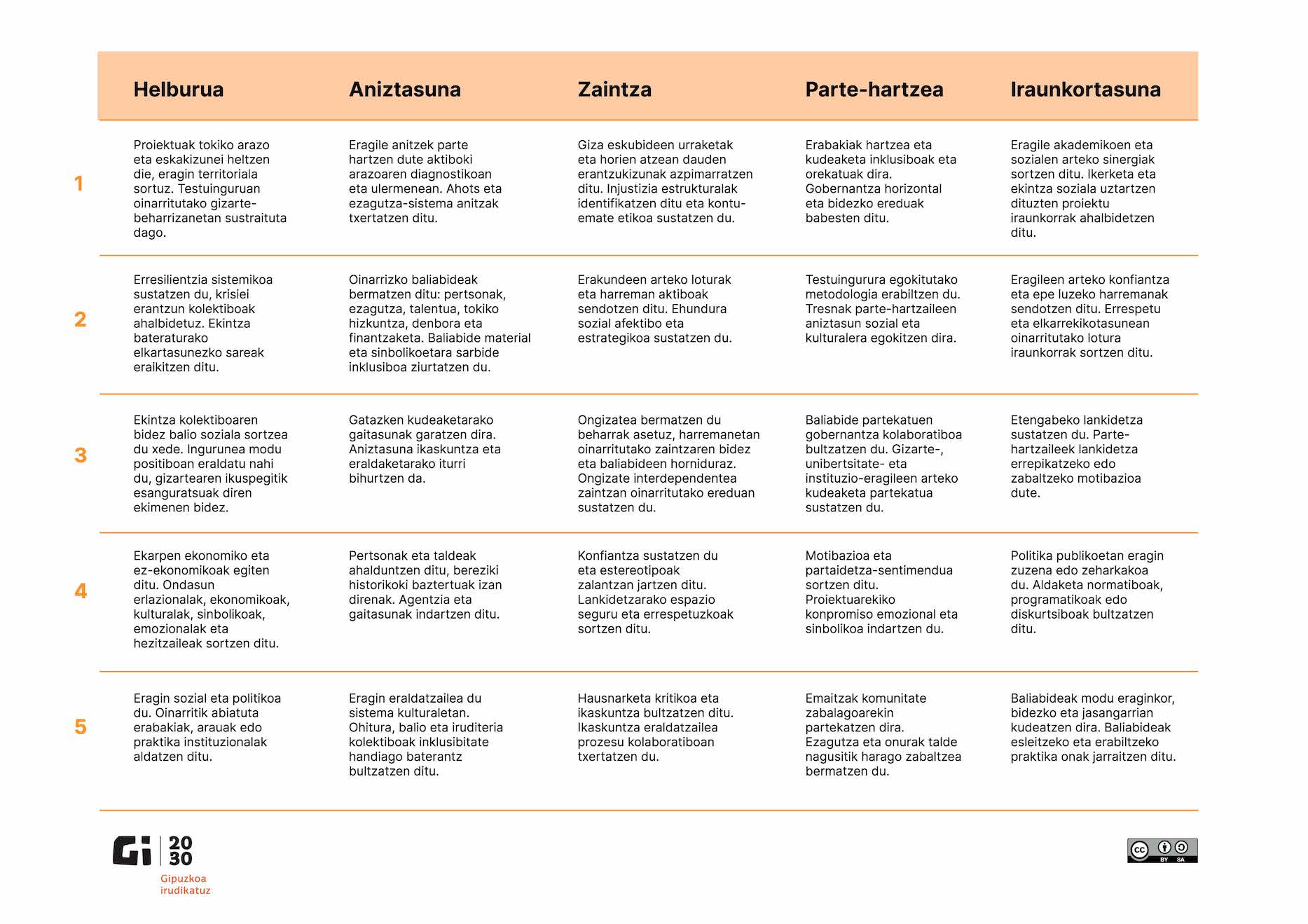 - RR: Baliabide funtsezkoen eskuragarritasuna eta kudeaketa: pertsonak, ezagutza, denbora, espazioa, dirua eta tokiko hizkuntza.
